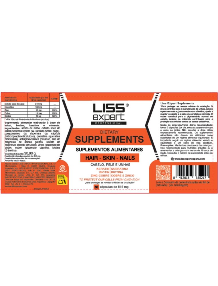 Suplemento alimentar à base de sabal, biotina, queratina e minerais.