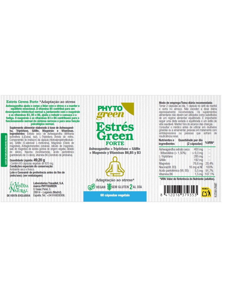 Extrato seco de Ashwagandha (Withania somnifera (L.) Dunal, raiz), L-Triptofano, Amido de milho, Componentes do invólucro da cápsula (Hidroxipropilmetilcelulose), SAMe (S-adenosil L-metionina), Magnésio (Óxido de magnésio), Antiaglomerantes (Celulose, Silicato de magnésio, Sais de magnésio de ácidos gordos de origem vegetal, Dióxido de silício), Niacina (Nicotinamida), Ácido pantoténico (Pantotenato de D-cálcio), Vitamina B6 (Cloridrato de piridoxina).