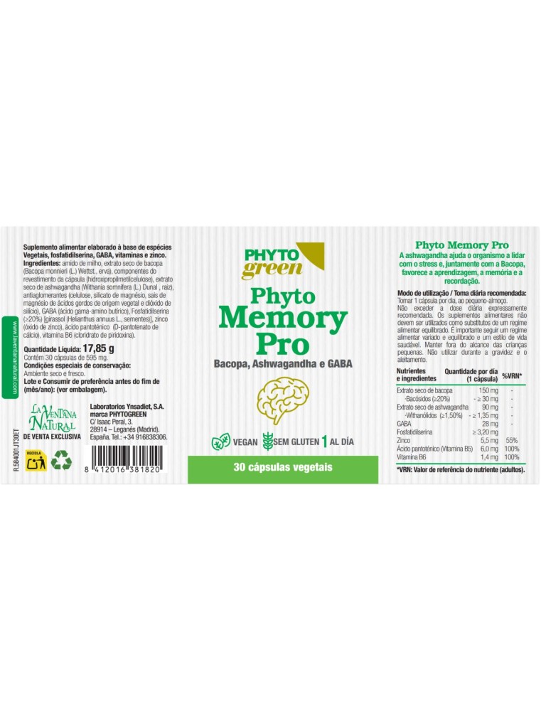 Allmidón de maíz, extracto seco de bacopa (Bacopa monnieri (L.) Wettst., hierba), componentes de la cubierta de la cápsula (Hidroxipropilmetilcelulosa), extracto seco de ashwagandha (Withania somnifera (L.) Dunal , raíz), antiaglomerantes (celulosa, silicato magnésico, sales magnésicas de ácidos grasos de origen vegetal y dioxido de silicio), GABA (ácido gamma aminobutírico) , fosfatidilserina (≥20%) [girasol (Helianthus annuus L., semillas)], zinc (óxido de zinc), ácido pantoténico (D-pantotenato cálcico), vitamina B6 (clorhidrato de piridoxina).