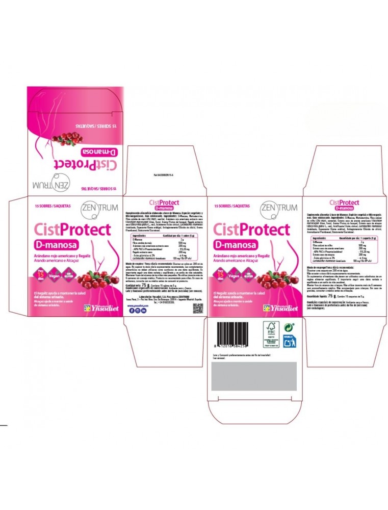 Suplemento alimentar à base de manose, espécies vegetais e microrganismos. Com edulcorante.