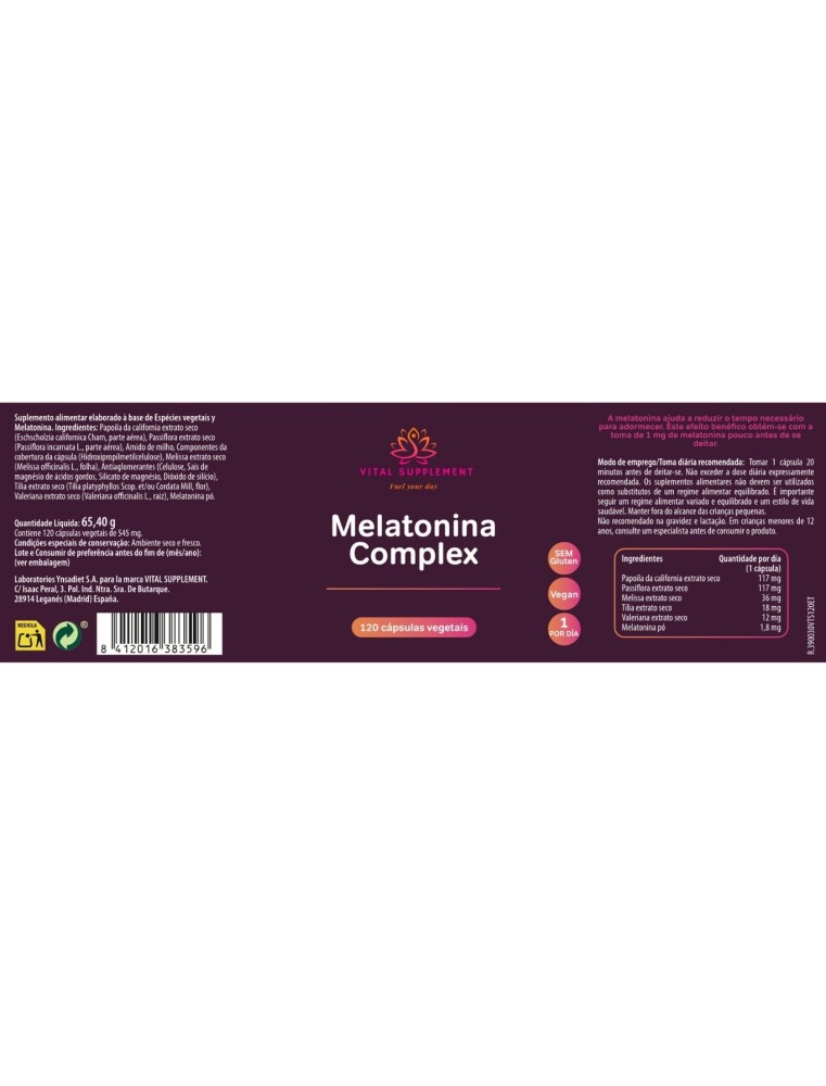 Extrato seco de papoila californiana (Eschscholzia californica Cham, partes aéreas), Extrato seco de passiflora (Passiflora incarnata L., partes aéreas), Amido de milho, Componentes do invólucro da cápsula (Hidroxipropilmetilcelulose), Extrato seco de melissa (Melissa officinalis L., folha), Antiaglomerantes (Celulose, Sais de magnésio de ácidos gordos, Silicato de magnésio, Dióxido de silício), Extrato seco de tília (Tilia platyphyllos Scop. e/ou Tilia cordata Mill., flores), Extrato seco de valeriana (Valeriana officinalis L., raiz), Melatonina em pó.