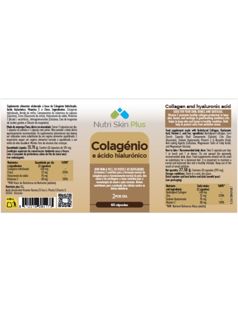 Suplemento alimentar à base de colagénio hidrolisado, ácido hialurónico, vitamina C e zinco.