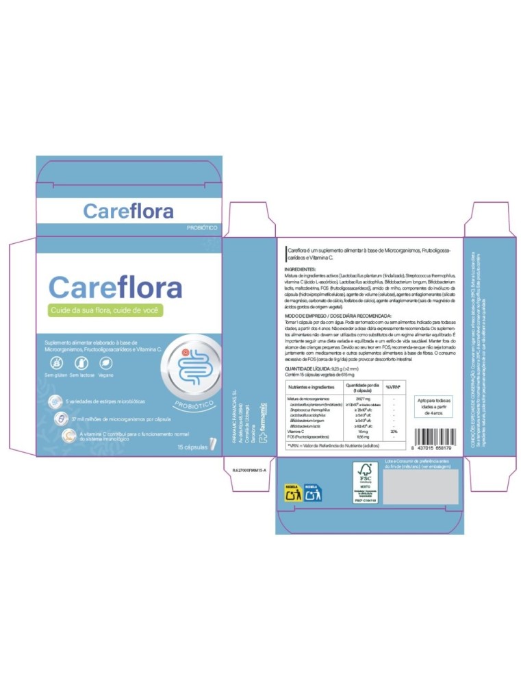 Suplemento alimentar à base de microrganismos, fruto-oligossacáridos e vitamina C.