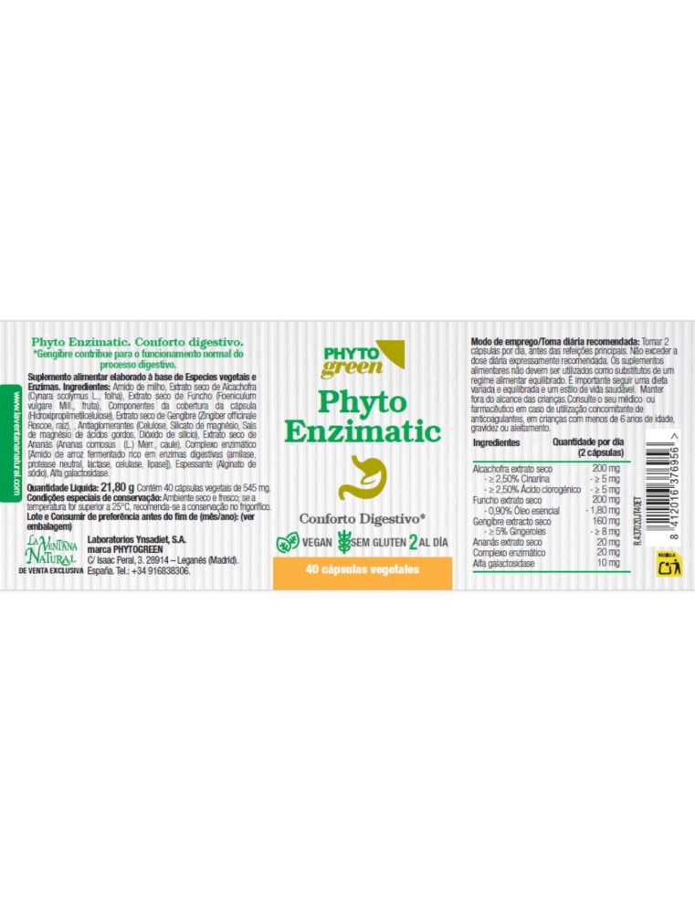 Almidón de maíz, Alcachofa extracto seco (Cynara scolymus L., hoja), Hinojo extracto seco (Foeniculum vulgare Mill., fruto), Componentes de la cubierta de la cápsula (Hidroxipropilmetilcelulosa), Jengibre extracto seco (Zingiber officinale Roscoe, raíz), Antiaglomerantes (Celulosa, Silicato magnésico, Sales magnésicas de ácidos grasos de origen vegetal y Dióxido de silicio), Piña extracto seco (Ananas comosus (L.) Merr., tallo), Complejo enzimático [Almidón de arroz fermentado rico en enzimas digestivas (amilasa, proteasa neutral, lactasa, celulasa, lipasa)], Espesante (Alginato sódico), Alfa galactosidasa.
